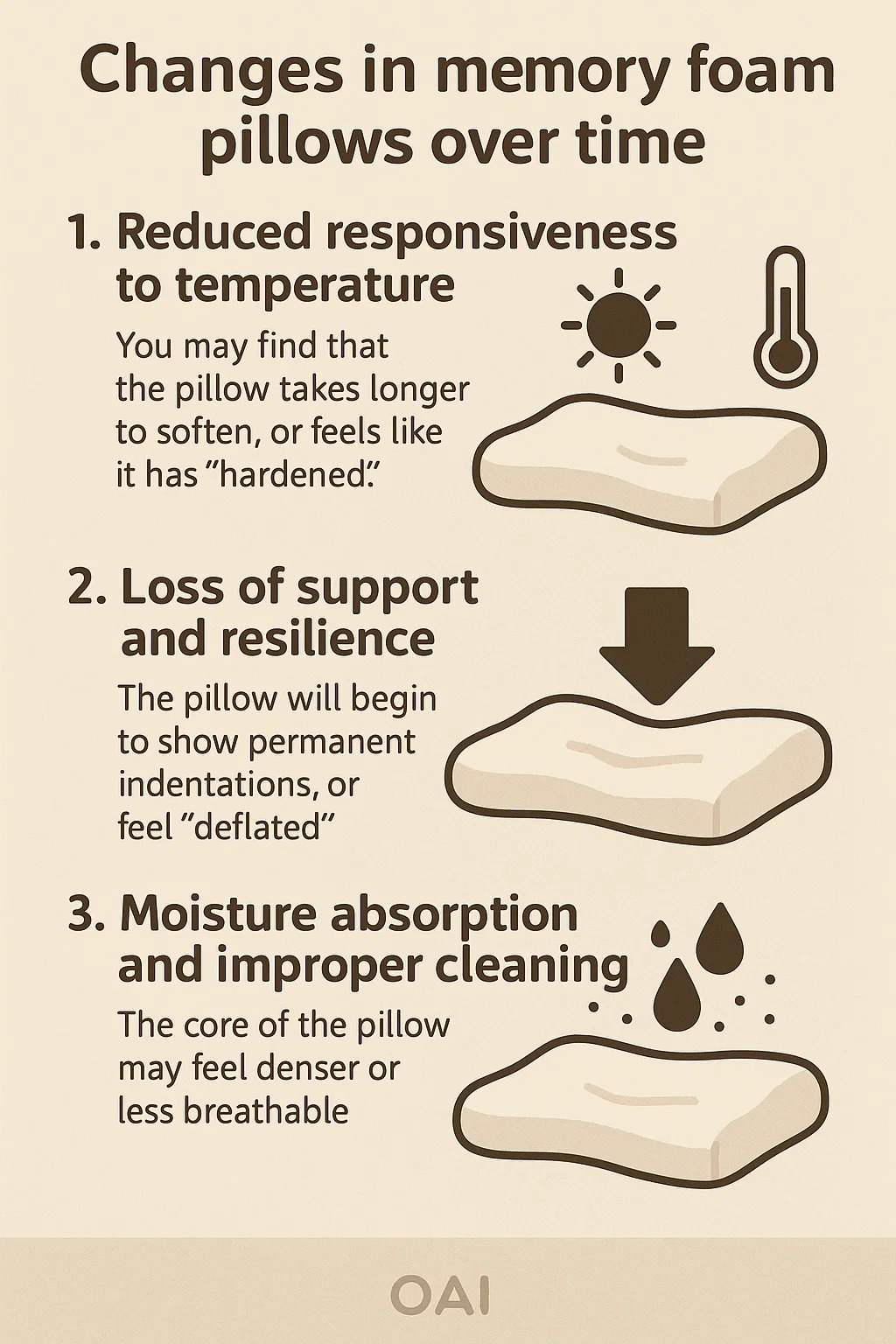 Sicut pulvinus super tempus adhibetur, aliqua ex elementis usus est ad formam memoriae spumae paulatim senectutis. Hoc potest ad tardiorem responsionem ducere corporis temperamentum et locus temperatus.