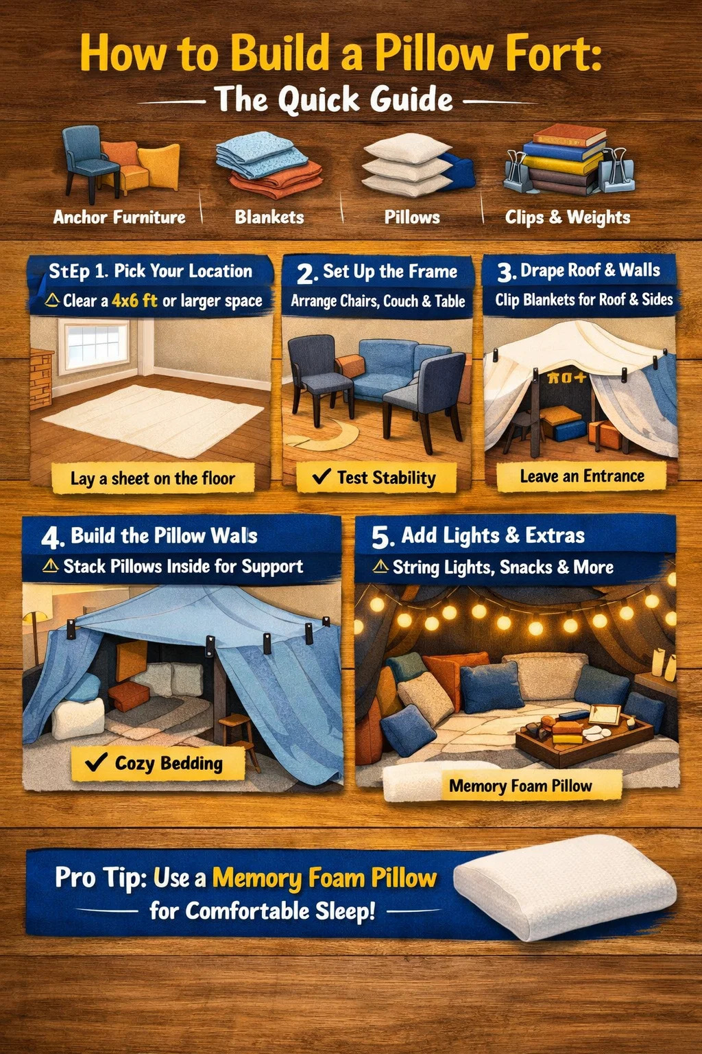 Exstructo pulvinari propugnaculum ad quattuor nucleos gradus descendit: fortem structuram basim (sicut lecti vel sellae), velamina stragula super verticem ad parietes et tectum, pulvillos acervos per margines et interiores ad sustentationem et velit, tunc omnia tondet vel gravia secu. Castellum bene constructum suam formam habere potest per horas — et cum interioribus cervicalibus rectis, vere commodior fit quam novitas puerilis.