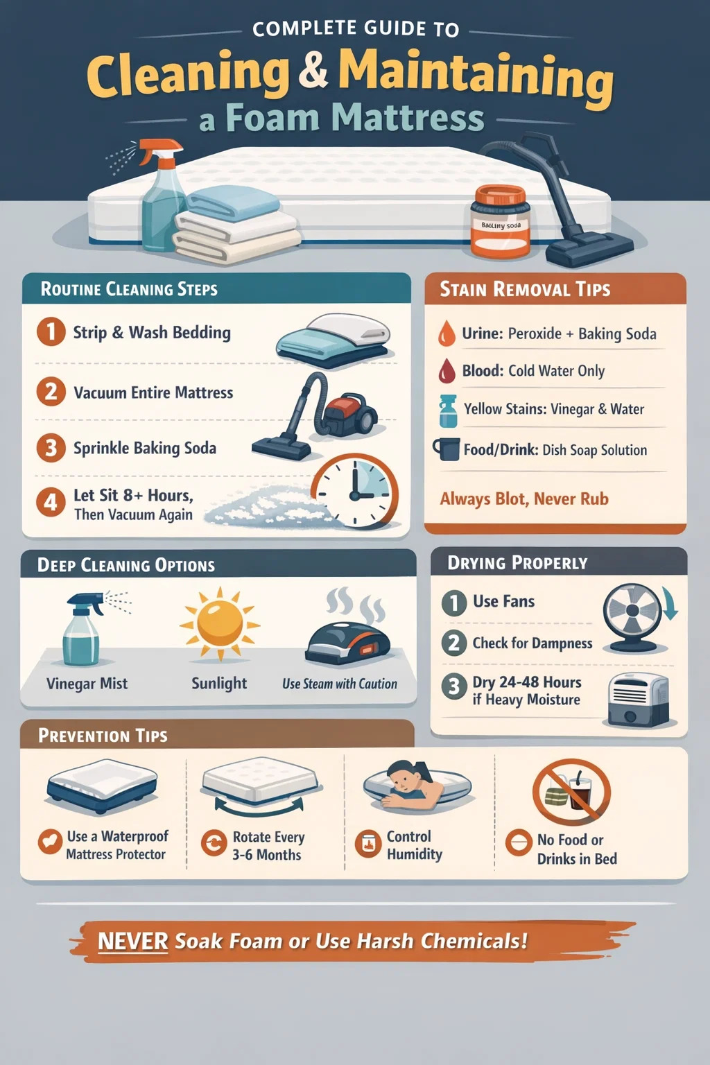 Spumam emundare culcitam, culcitam exuere, totam superficiem penitus vacuum, maculas quaslibet maculas tractare, mixtis smegma saponis et aquae frigidae lenis, nitro super culcitam large aspergere, ad minimum 8 horas sedeat, deinde iterum vacuum. Numquam inebriat memoria spuma culcitra aqua vel in lavacro apparatus — ita cellulas spumas frangit in perpetuum et maxime warantis evacuat.