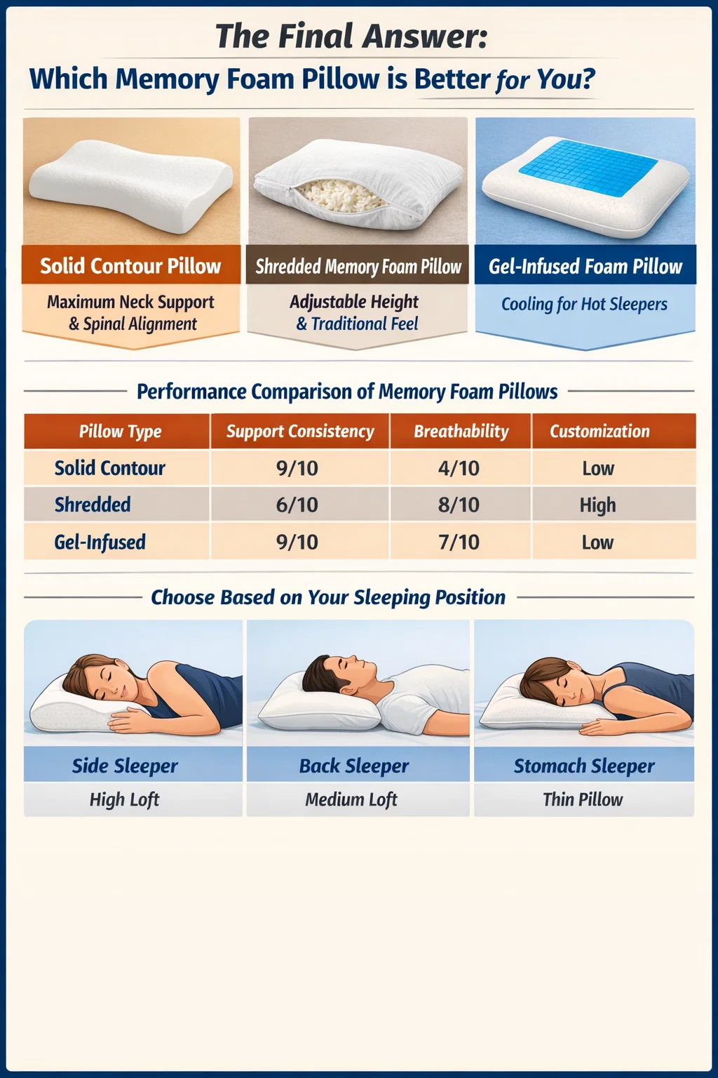 Pulvinus "optimus" non est, sed victor clarus est in habitu tuo dormienti subnixus. Si prioritize maximum auxilium et medullae colli alignment, a solidum memoria forma pulvinar spumam praestantior. Si mavis traditum sentire facultatem accommodare altitudinem, a aluminis memoria pulvinar spumam sit potior. Nam qui saepe sudorem evigilant, a gel-infusum seu aperta-cell memoriae spumam cervical solus est optio viable ne overheating.